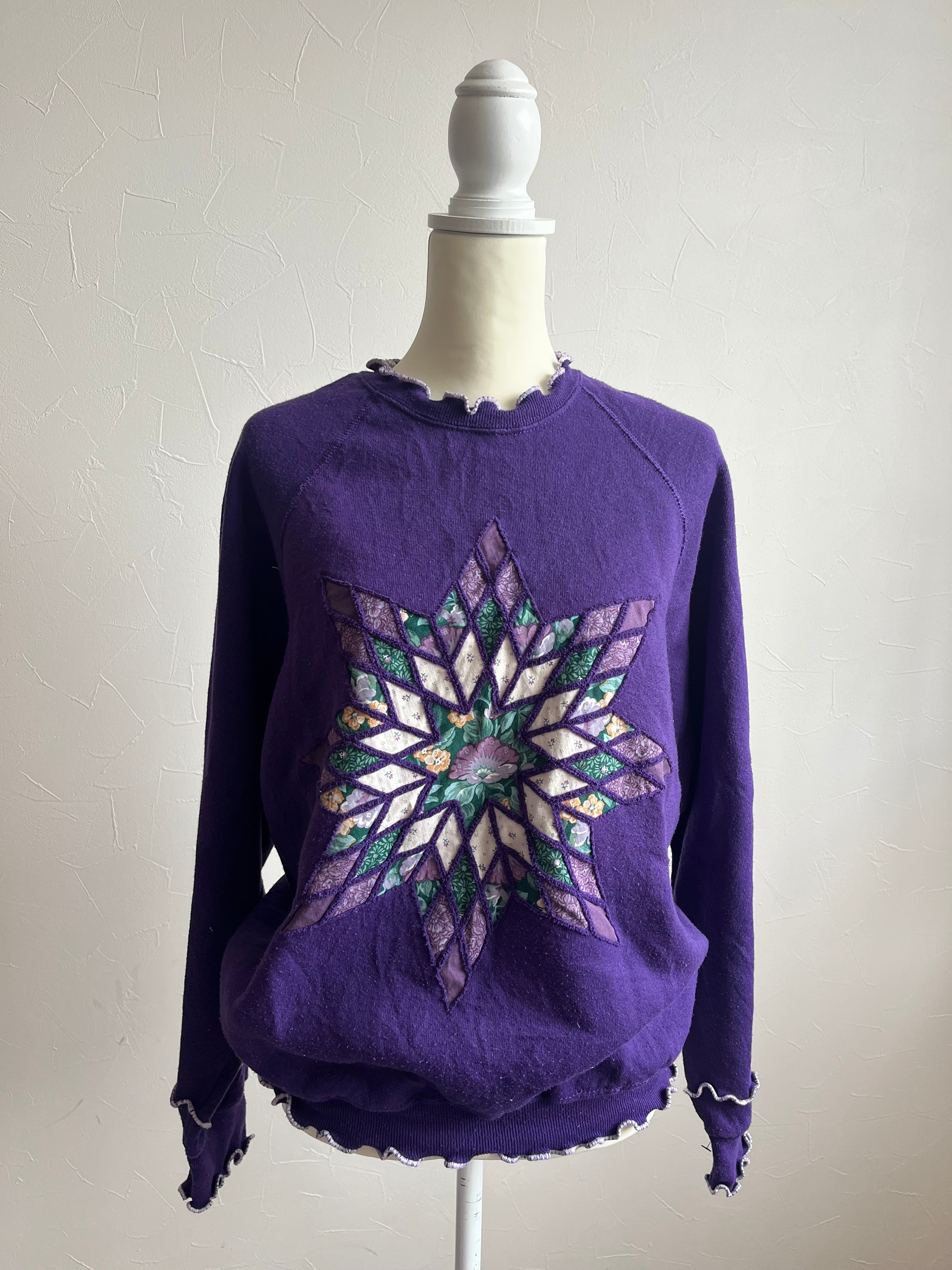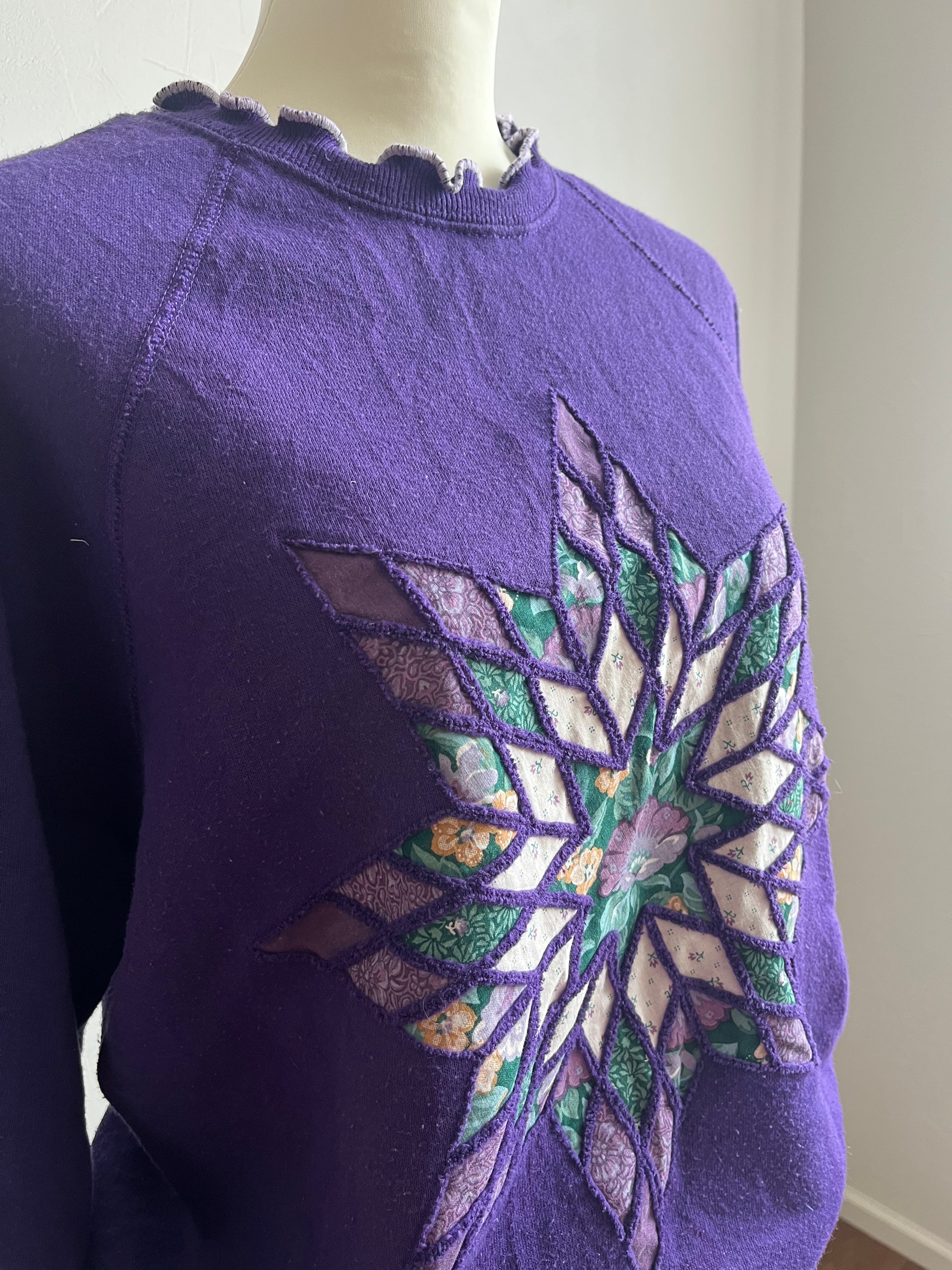 パープルの色味と雪の結晶のようなデザイン、花柄生地がかわいいこだわりデザインの1着。