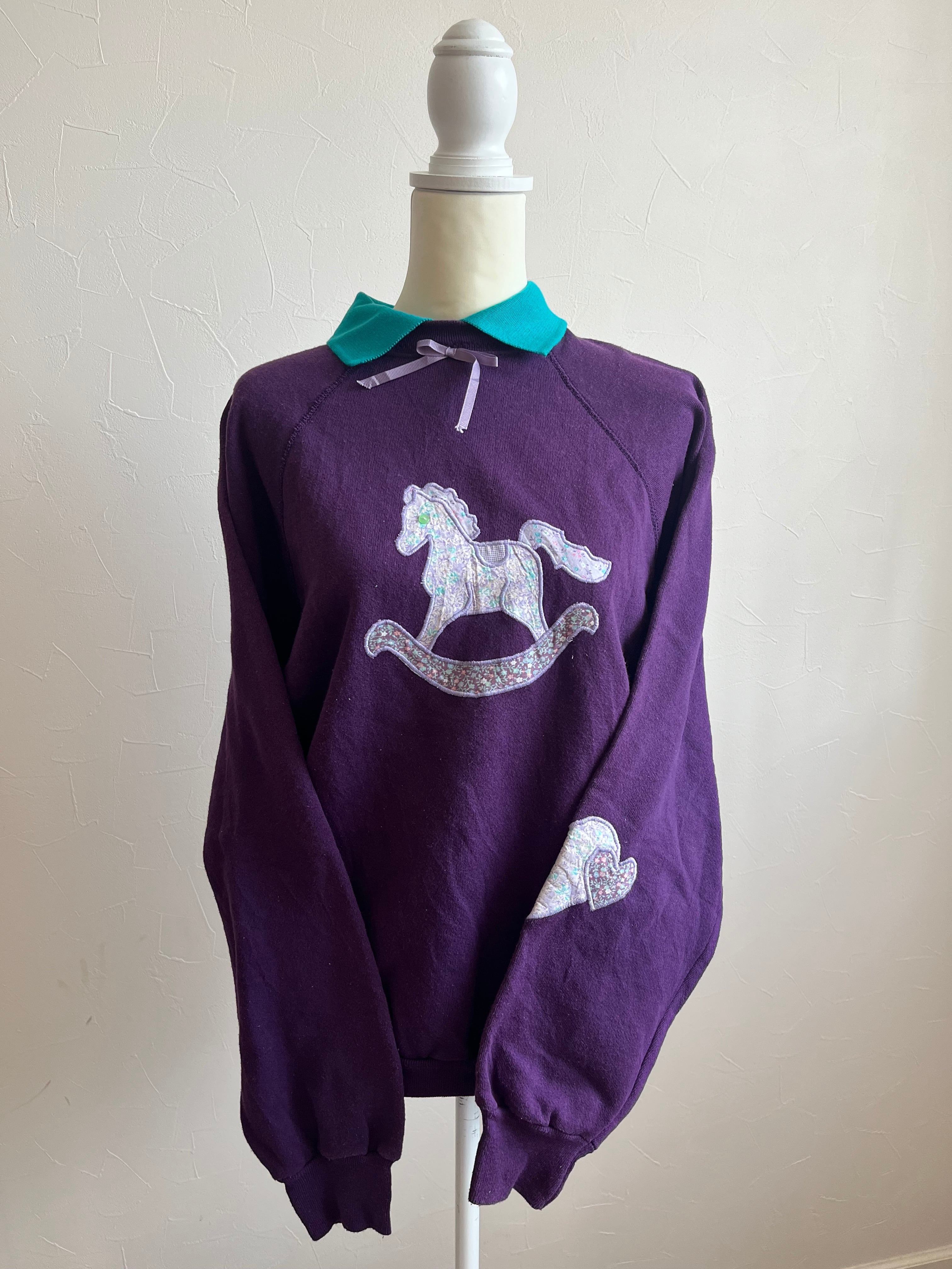 グリーンの襟付き、木馬デザインのパープルスウェット。