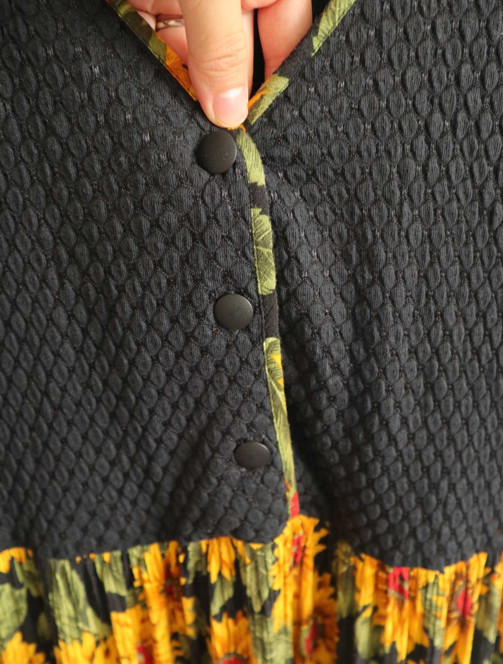 後ろはひまわり柄の生地と同じ生地の細リボンが付いており、襟はVネックで胸元に3つボタンが付いています。