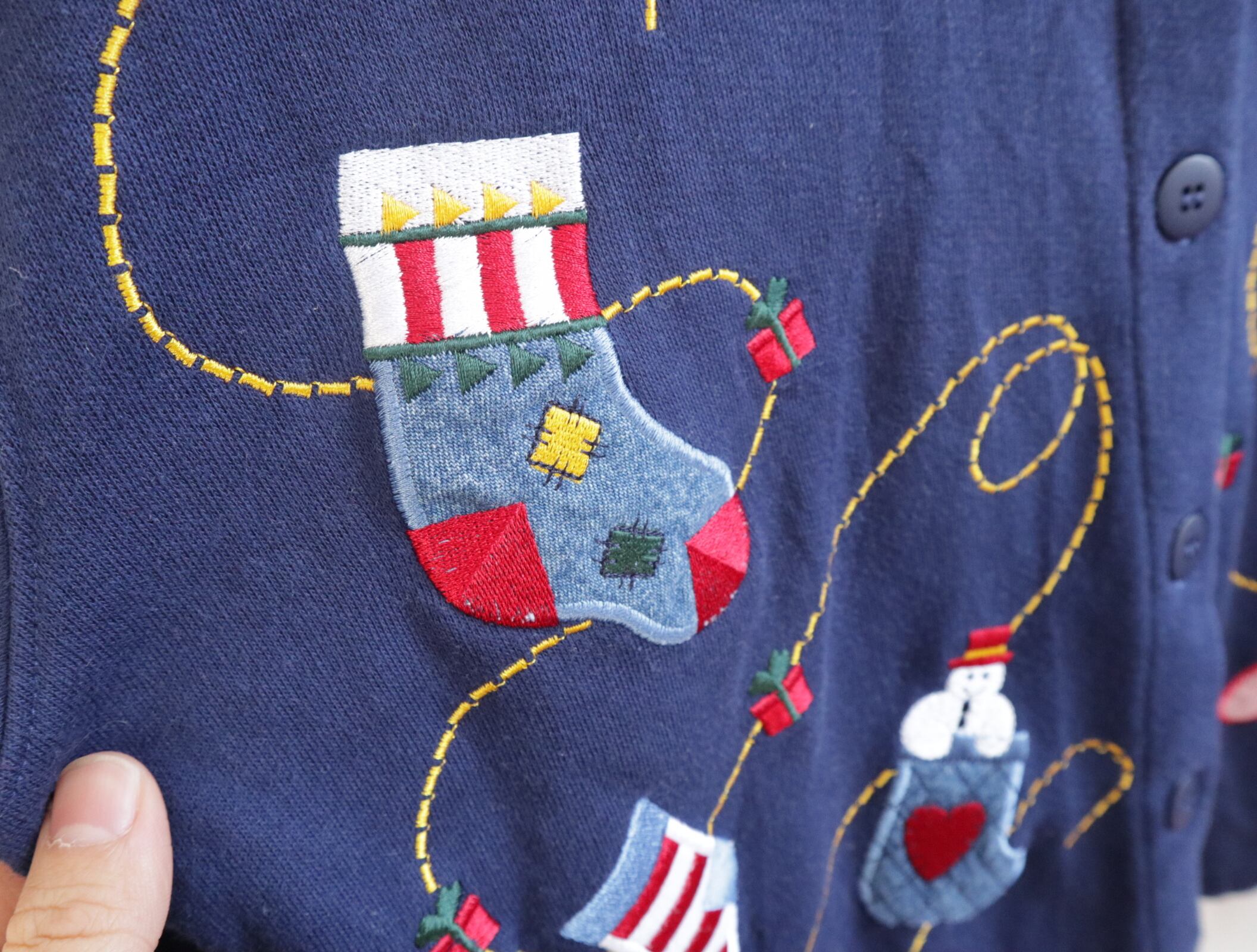 クリスマスホリデーな雰囲気のカラフルな靴下柄のスウェットカーディガンです。
