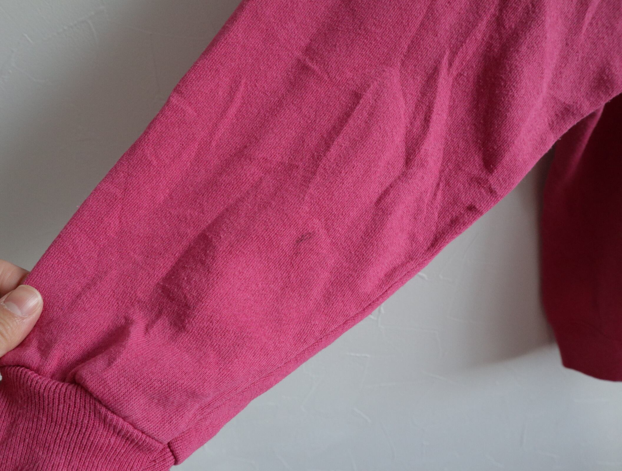 あまり目立ちませんが、右袖に1cmくらいの黒ペンが触れたかのような薄めの汚れアリです。写真4〜5枚目にてご確認ください。