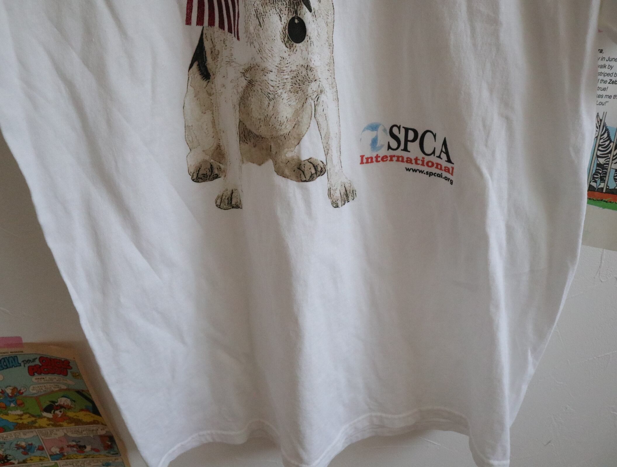 アメリカのフラッグをくわえたワンちゃんのTシャツ。